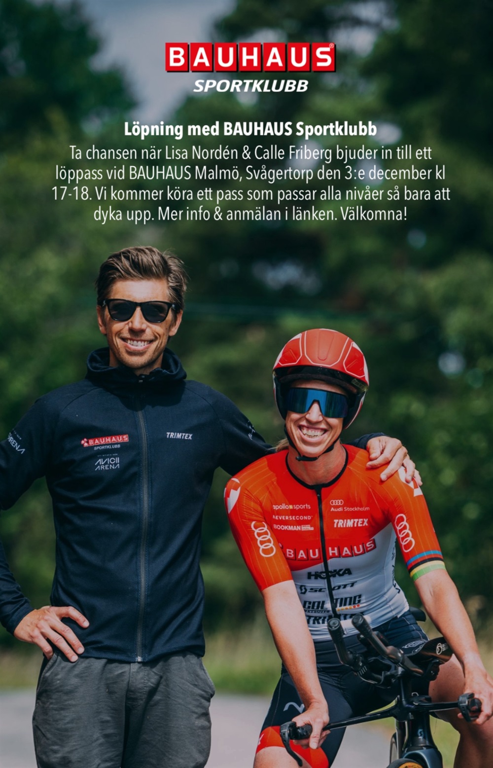 Ta chansen när BAUHAUS Sportklubb med OS-medaljören Lisa Nordén & cykelesset Calle Friberg i spetsen bjuder in till ett löppass vid BAUHAUS Malmö, Svågertorp den 3:e december kl 17-18. Vi kommer köra ett pass med korta intervaller som passar alla nivåer så man behöver inte vara orolig att hamna efter eller att vänta på gruppen.